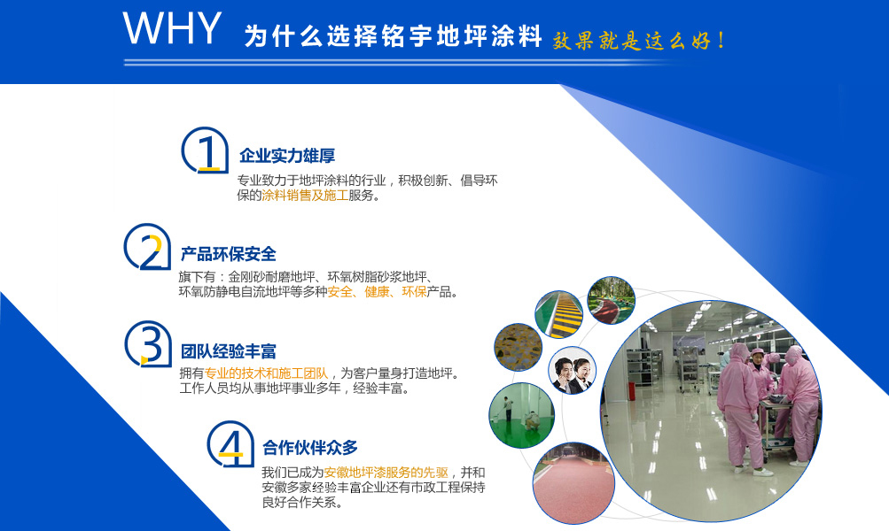 安徽銘宇建材科技有限公司是一家致力于地坪涂料的行業(yè),旗下有金剛砂耐磨地坪,環(huán)氧樹脂砂漿地坪,環(huán)氧防靜電自流地坪,停車場防滑地坪,混凝土密封固化劑和丙烯酸球場,無震動止滑車道、塑膠跑道、工廠地板漆等工程施工服務(wù)。 憑借本身的技術(shù)能力和研發(fā)條件,加上多年對環(huán)氧地坪和耐磨硬化地坪等各類工業(yè)地坪的涂裝、施工的實(shí)踐經(jīng)驗(yàn)、技術(shù)己處于國內(nèi)專業(yè)水平,經(jīng)檢測機(jī)構(gòu)檢驗(yàn)符合相應(yīng)的技術(shù)標(biāo)準(zhǔn)。同時安徽銘宇建材科技有限公司還組建了經(jīng)驗(yàn)豐富的工程技術(shù)隊(duì)伍以及工程施工隊(duì)伍、簡歷了完善的售后施工服務(wù)體系,滿足用戶的需要。 安徽銘宇建材科技有限公司是一家積極創(chuàng)新、倡導(dǎo)環(huán)保的涂料銷售及施工服務(wù)的廠家,安徽銘宇建材科技有限...